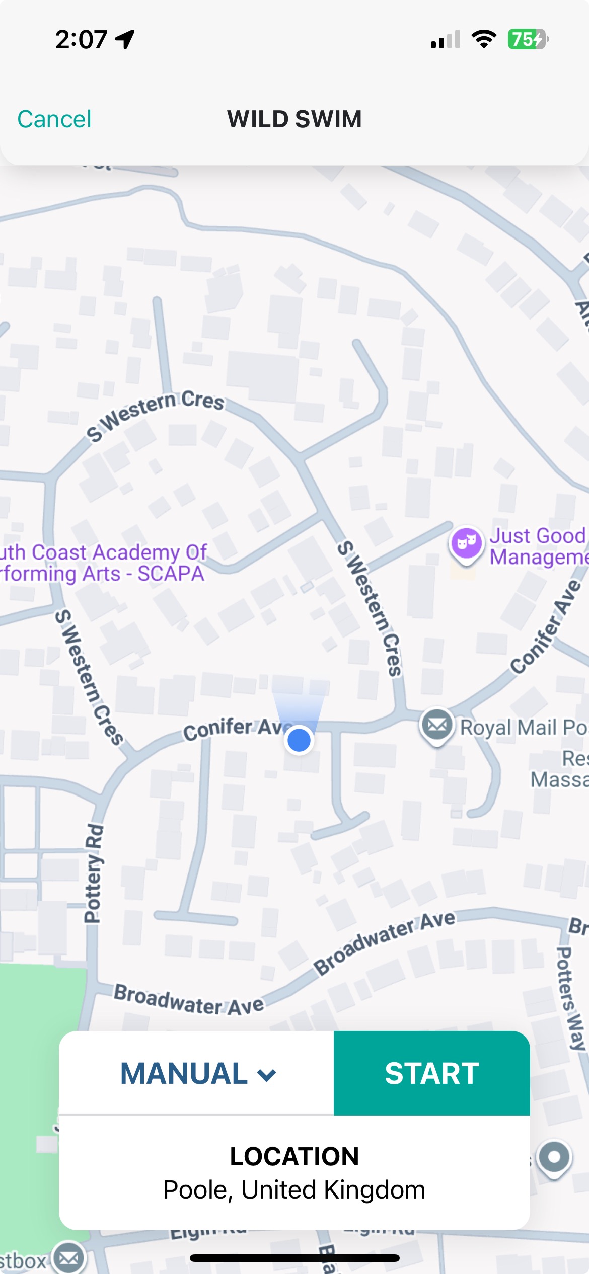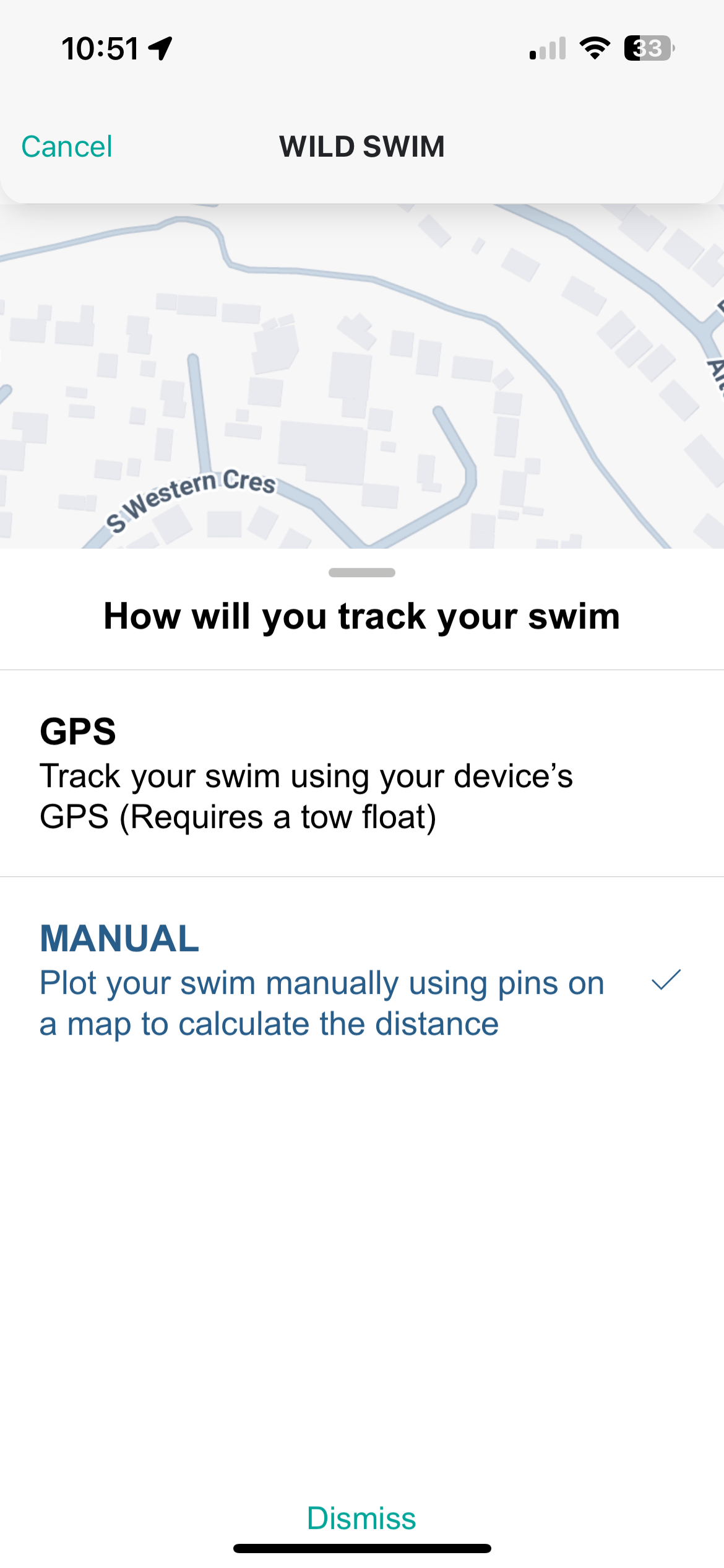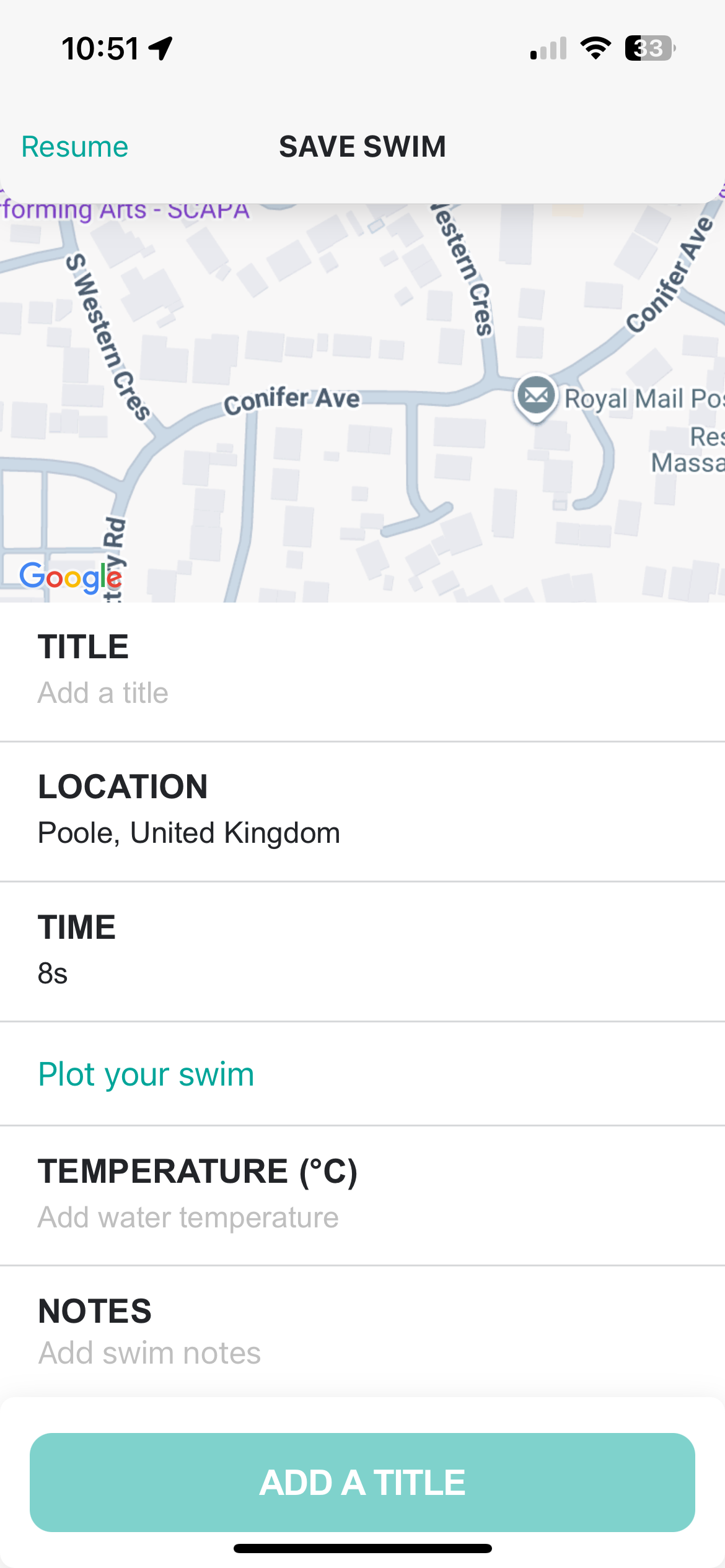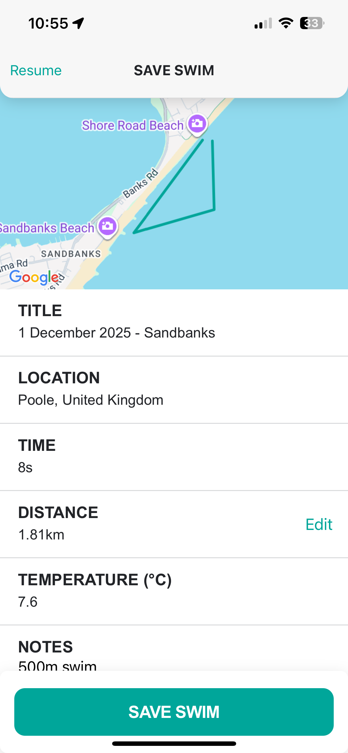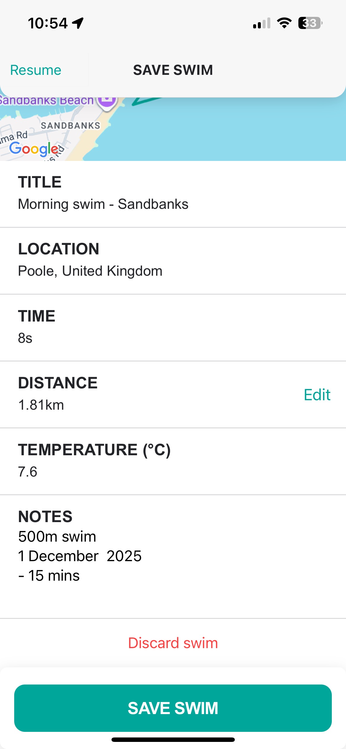 | Move the map to your swim location and tap on the screen to drop pins to plot your route. When done, press FINISHED | Click EDIT if you wish to amend the distance ADD NOTES to capture accurate time and any other information you wish to save. Press SAVE SWIM ![]() |